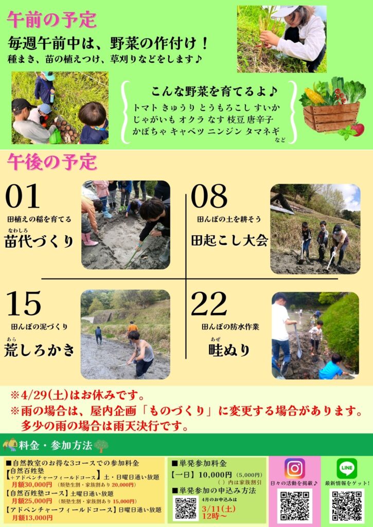 百姓一年目としては、まずは自然と百姓の暮らしの一年間の季節の巡りを体感することが大切です。4月は、種まき苗づくりなど農作業が多忙な季節。このタイミングを逃すと稲作、春の畑作ともにできないので、一日一日が大切な時期になります。